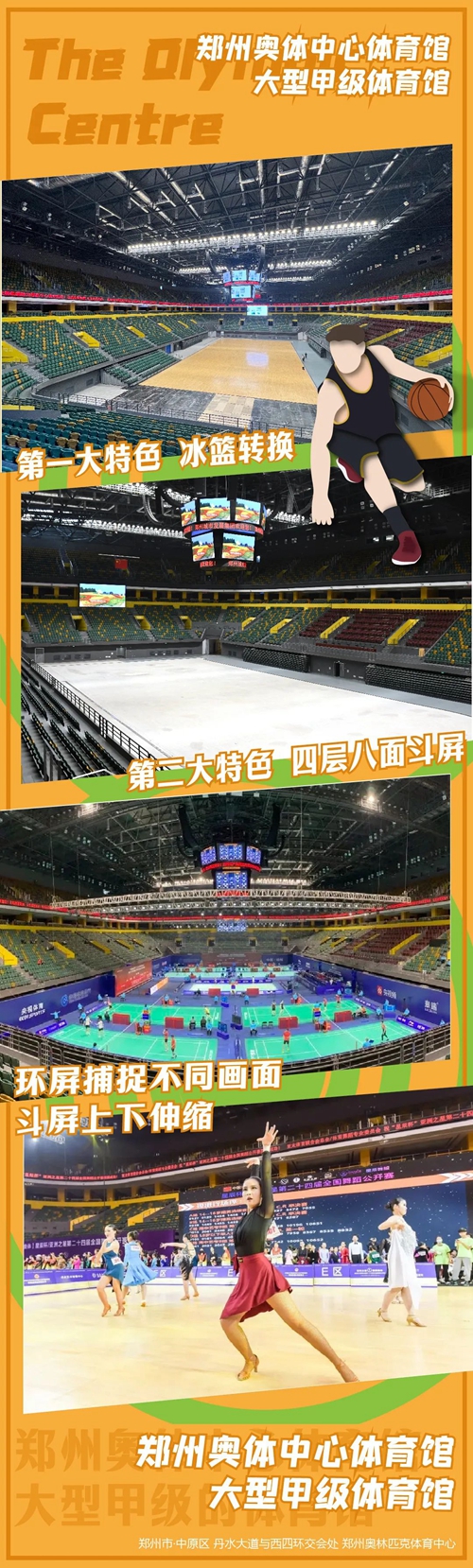 奧體中心體育館作為大型甲級體育館,空間使用靈活,場地利用率高。目前已經舉辦了2019年世界乒聯巡回賽總決賽、2020年世界乒聯巡回賽總決賽、2019年全國羽毛球單項冠軍賽、2021年全國羽毛球冠軍賽暨第十四屆全運會羽毛球項目資格賽、2022年河南省第一屆職業技能大賽、2023永慶安瀾德云社岳云鵬·孫越相聲專場等知名賽事活動。下半年,將有更多知名演藝、賽事活動在奧體中心體育館舉辦。主館西側為總面積約2100平方米的籃球熱身館,目前已經舉辦過籃球、跆拳道、羽毛球等體育賽事,以及企業展銷、社區聯誼、動漫展等活動;北側為冰上運動中心,擁有1800平方米國際標準冰,致力于為中部地區提供從啟蒙到精英級的系統化冰上運動培訓。