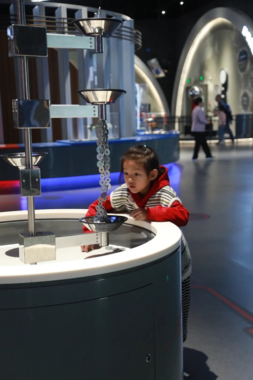 下一站是“看得見的奧秘”展廳。在參觀中,不難發(fā)現(xiàn),這里主要提煉了物質(zhì)、運(yùn)動和能量三個(gè)小切口作為知識內(nèi)容,以“透過現(xiàn)象看本質(zhì)”為主題,劃分“物質(zhì)世界”“能量法則”“運(yùn)動大觀”“度量萬物”四個(gè)分主題展區(qū)。