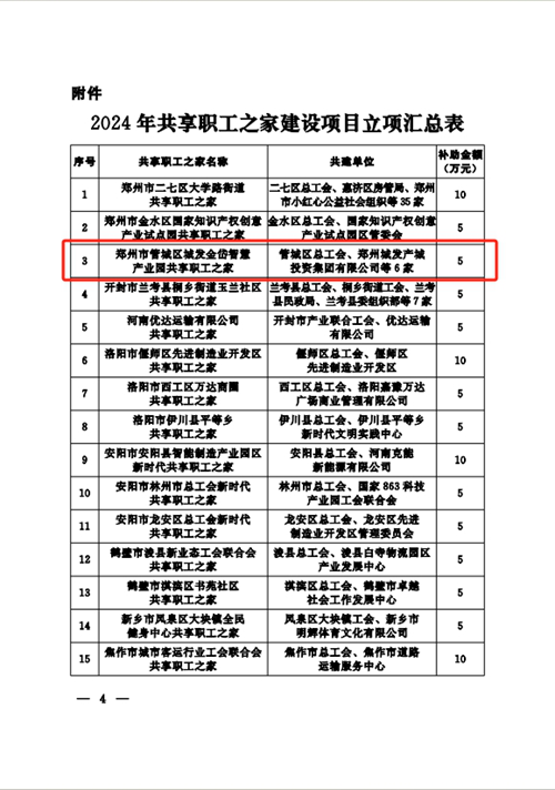 近日,河南省總工會發布《關于2024年共享職工之家建設項目立項的通知》,決定對城發金岱智慧產業園共享職工之家等32個共享職工之家建設項目進行立項,并對城發金岱智慧產業園共享職工之家給予資金補助,鄭州市僅有三家職工之家獲得立項,這是城發金岱智慧產業園共享職工之家建設運營后取得的第一份殊榮。